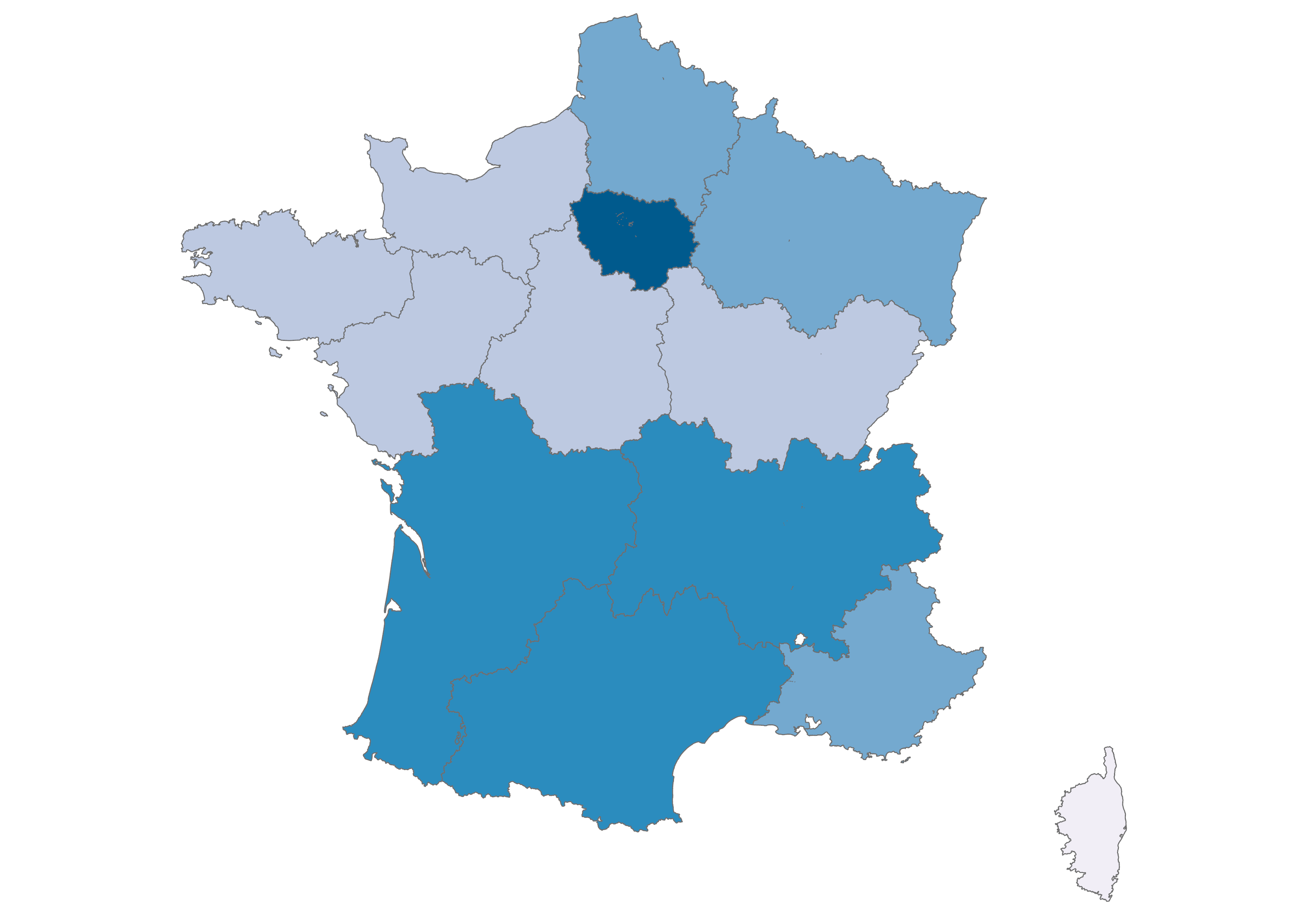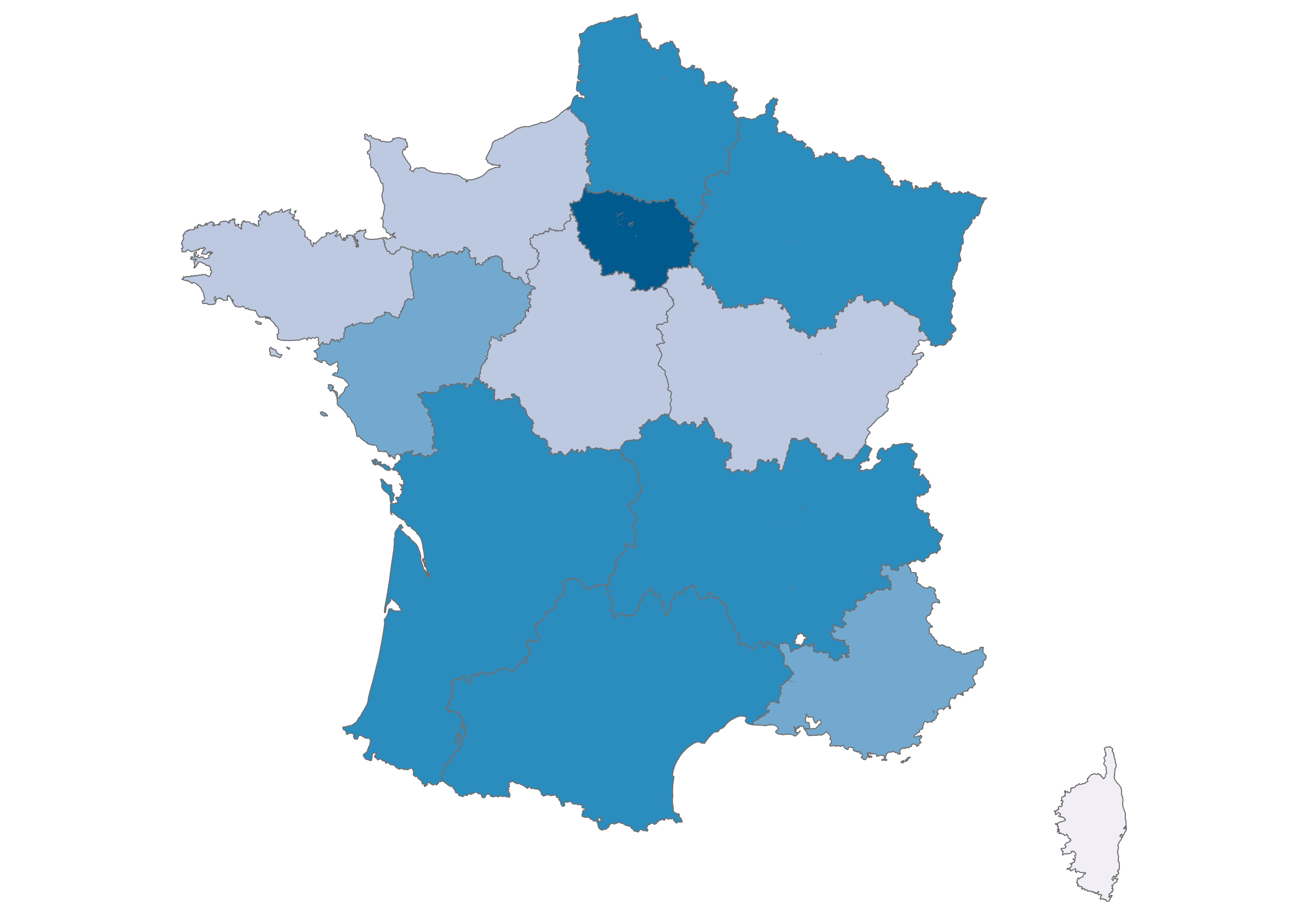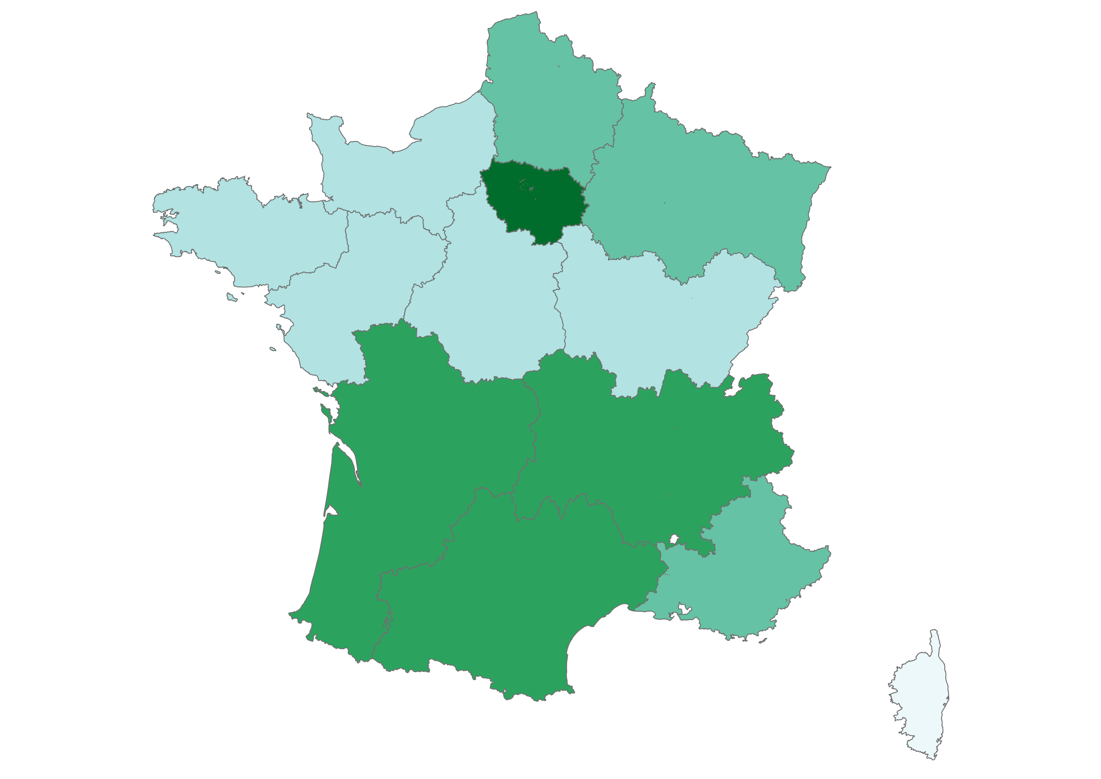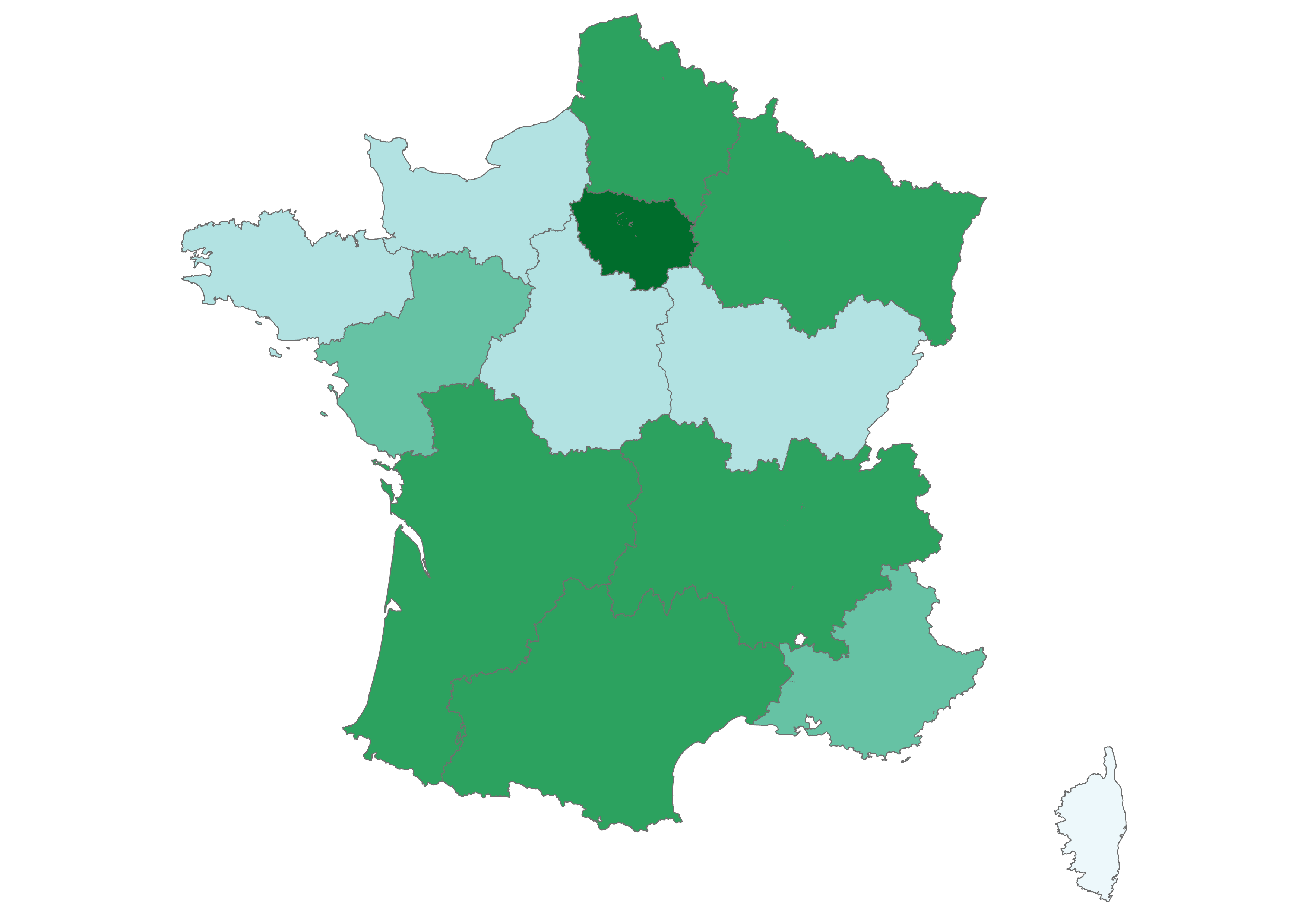 Our focus is on the thirteen metropolitan administrative regions of France, which you can explore in the maps below. Click the arrow to see climate change-related questions and statements and explore the attitudes of each region