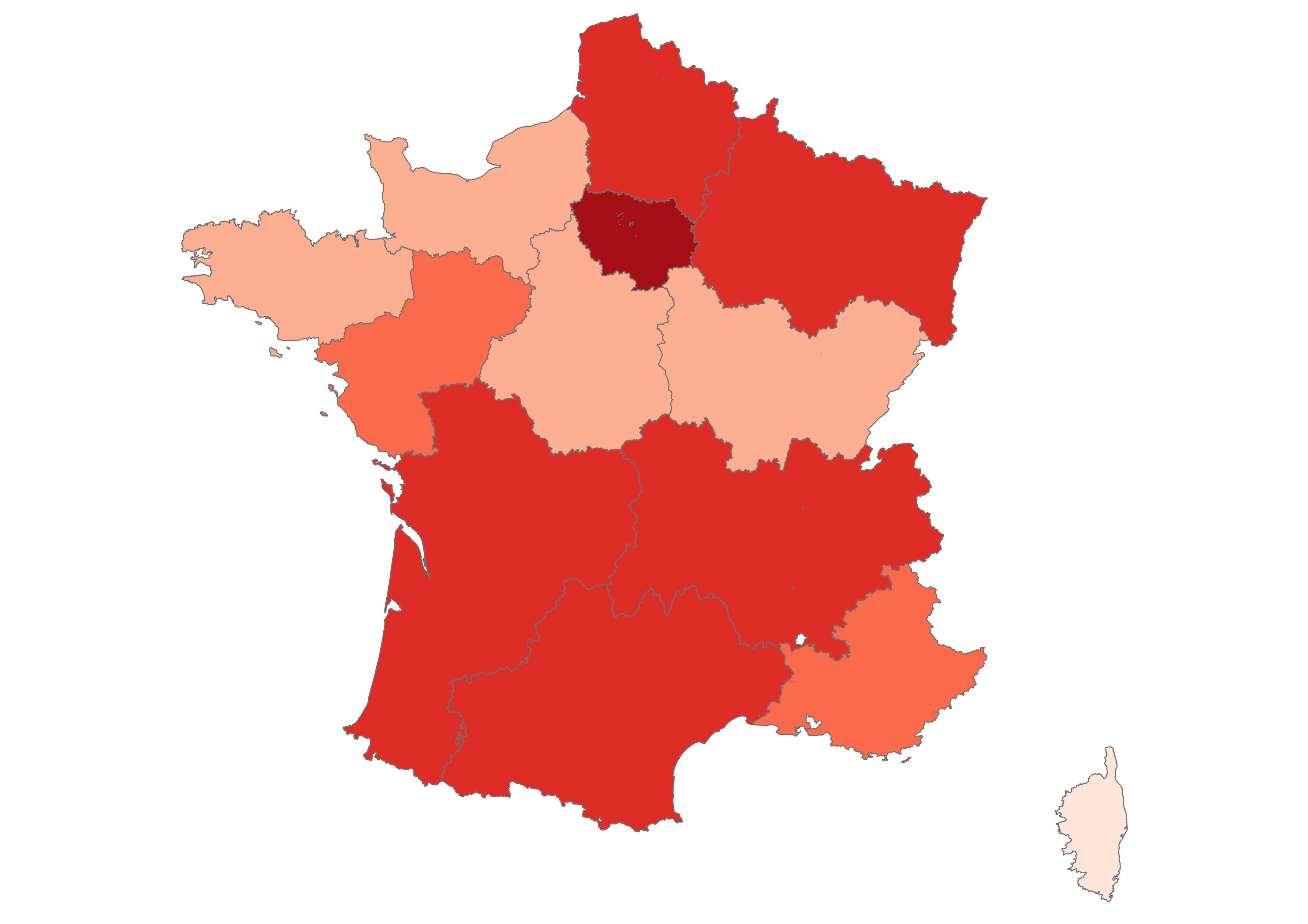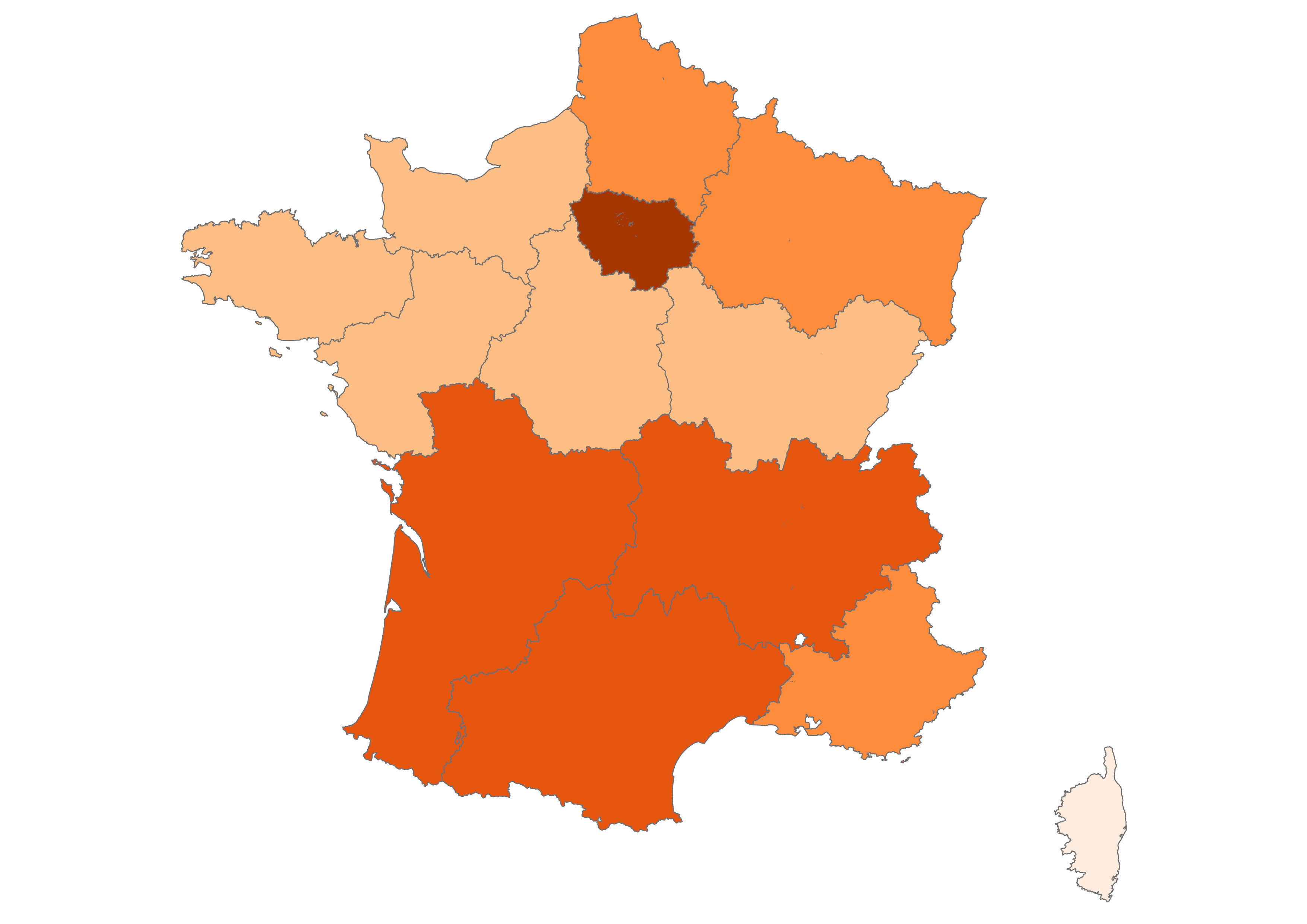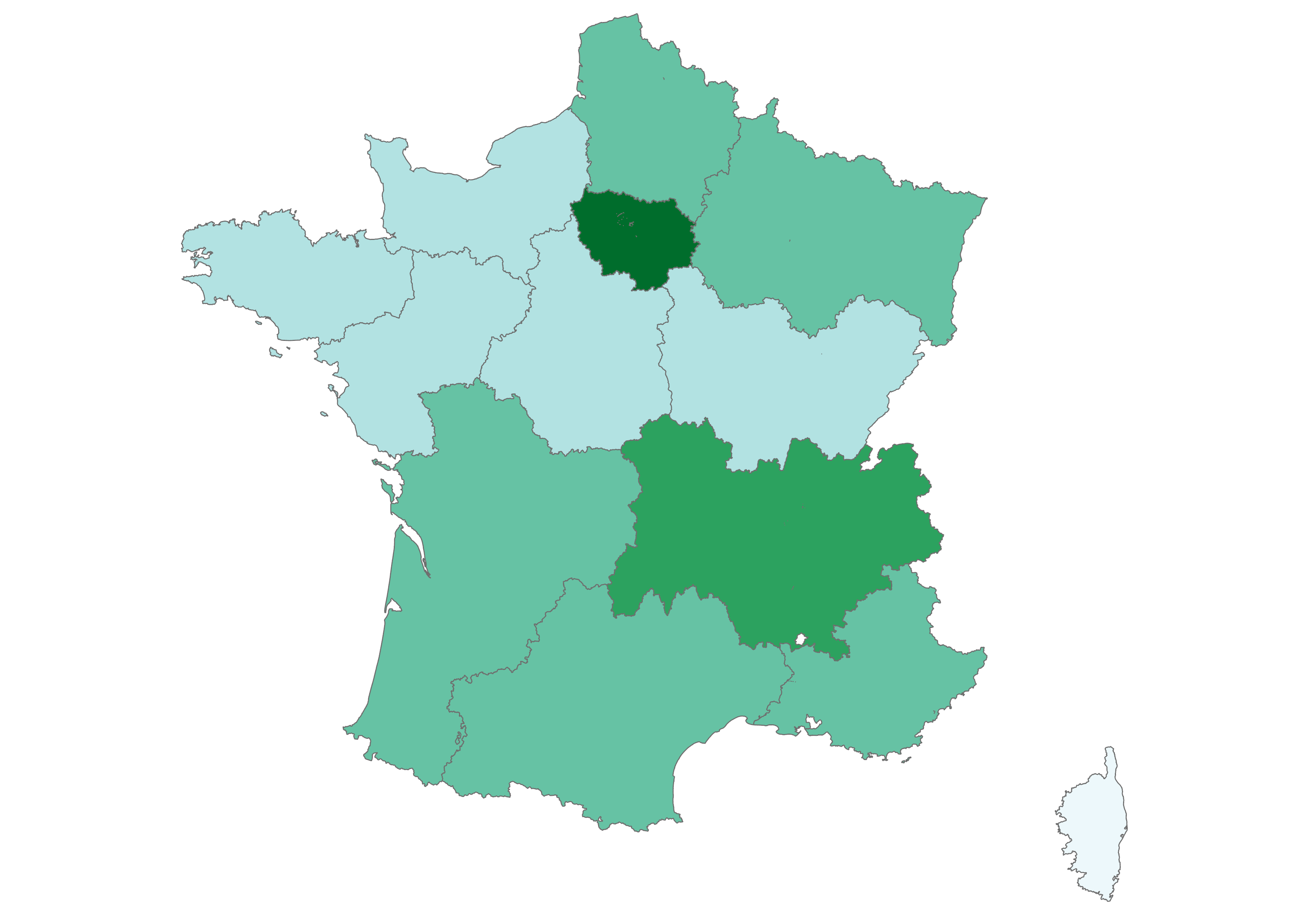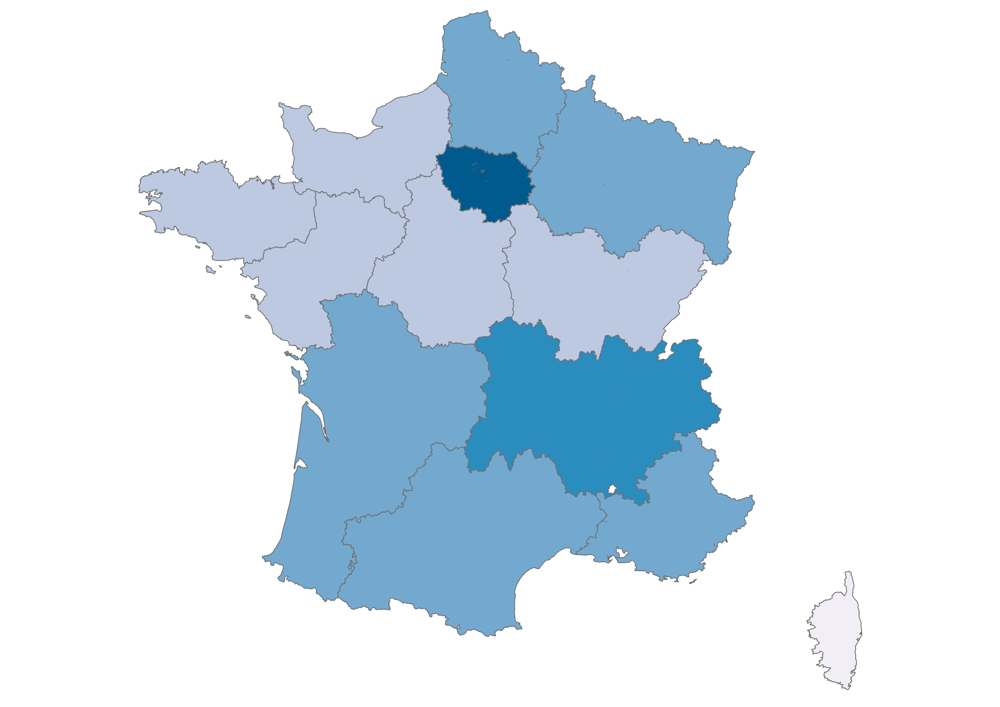 Our focus is on the thirteen metropolitan administrative regions of France, which you can explore in the maps below. Click the arrow to see climate change-related questions and statements and explore the attitudes of each region